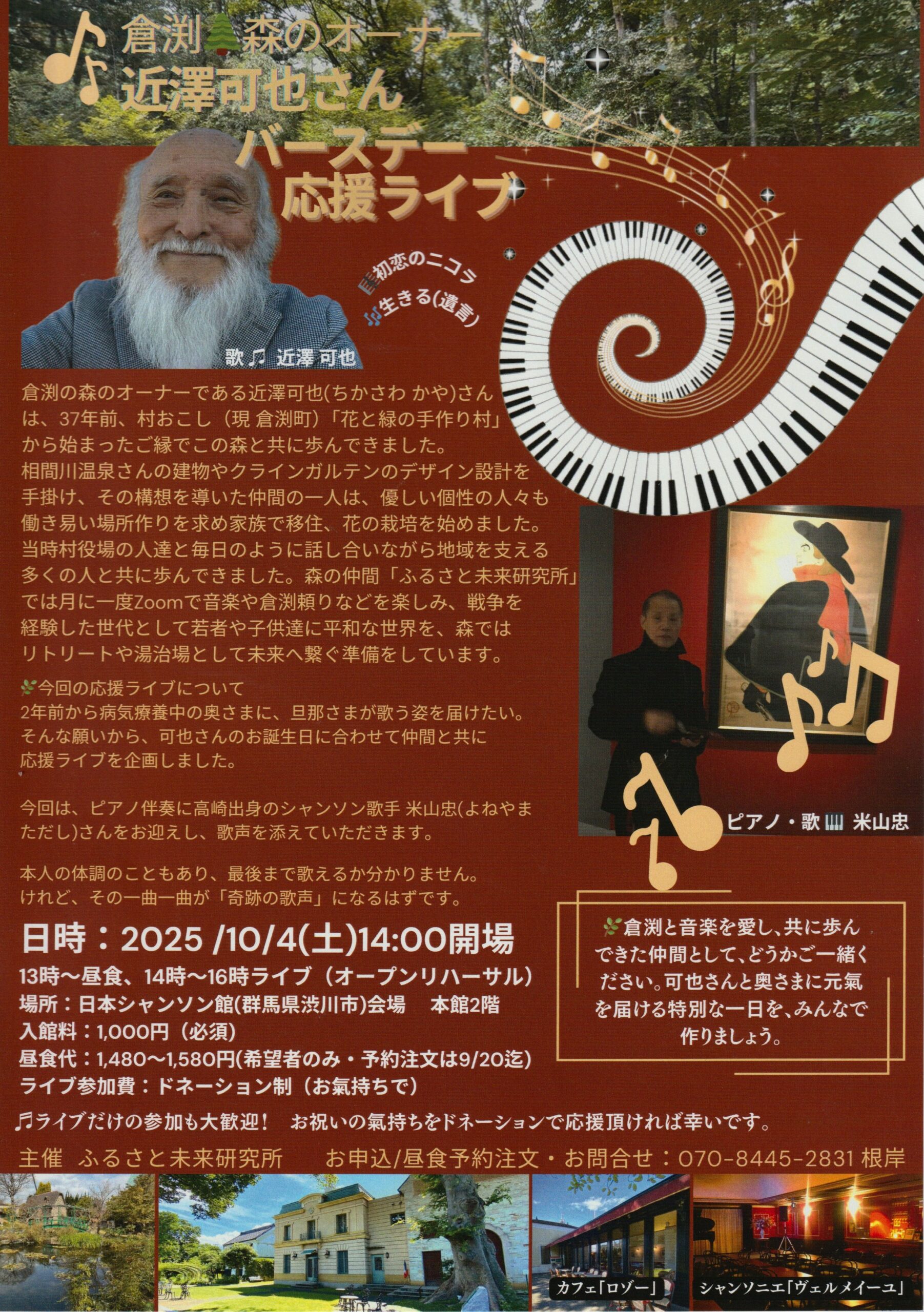 丹下健三直下の建築士として名を成した上に、役者としても活躍、さらに近年は詩吟、シャンソンの歌い手としても多くの大会で審査員を唸らせる近澤可也 さんが91歳を迎える10月4日、日本のシャンソン界の聖地と謳われる群馬県・渋川のシャンソニエ「ヴェルメイユ」でバースデイ・ライヴを予定している。モネゆかりの名園を鑑賞し、フレンチ・ランチを楽しみ、筋金入りのシャンソンを堪能する初秋の1日、新宿バスタから渋川まで1本、2時間足らずの高速バスの旅。